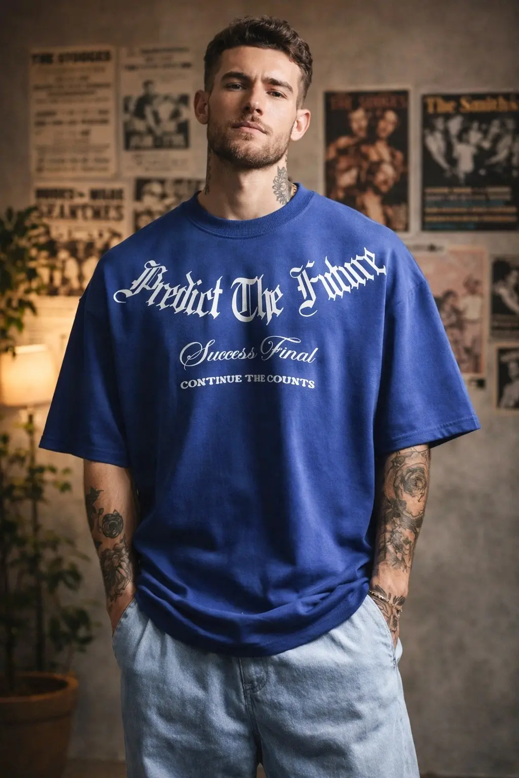 Step into your element with Bochike’s Futurecast oversized tee — where bold gothic text meets a sharp minimalist layout. The vibrant royal blue and off white and powerfu front print aren’t just style; they’re a silent declaration of mindset.Crafted from ultra-soft, heavyweight cotton for that premium, drop-shoulder drape — this is the T-shirt that doesn’t just fit you, it follows your flow. With statements like “Predict The Future” and “Success Final,” it’s made for the ones who hustle quietly but move loudly.Whether you’re styling it solo or layering it for your streetwear stack, this oversized tee will always speak before you do.